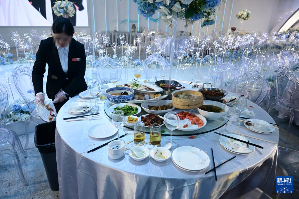 10月15日,在安徽合肥一个婚宴现场,宾客离去后桌上剩余大量餐食,有些盘中菜品几乎未动,最终被倒入垃圾桶。