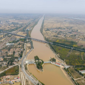 10月16日,用于灌溉的黄河水流经内蒙古巴彦淖尔市临河区境内的总干渠第二分水枢纽(无人机照片)。