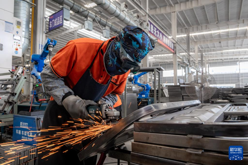 10月16日,在江苏省徐州市丰县电动车生产企业车间内,工人在焊接电动三轮车配件。