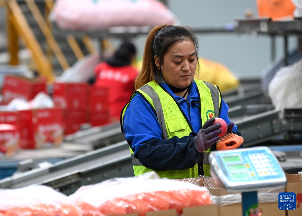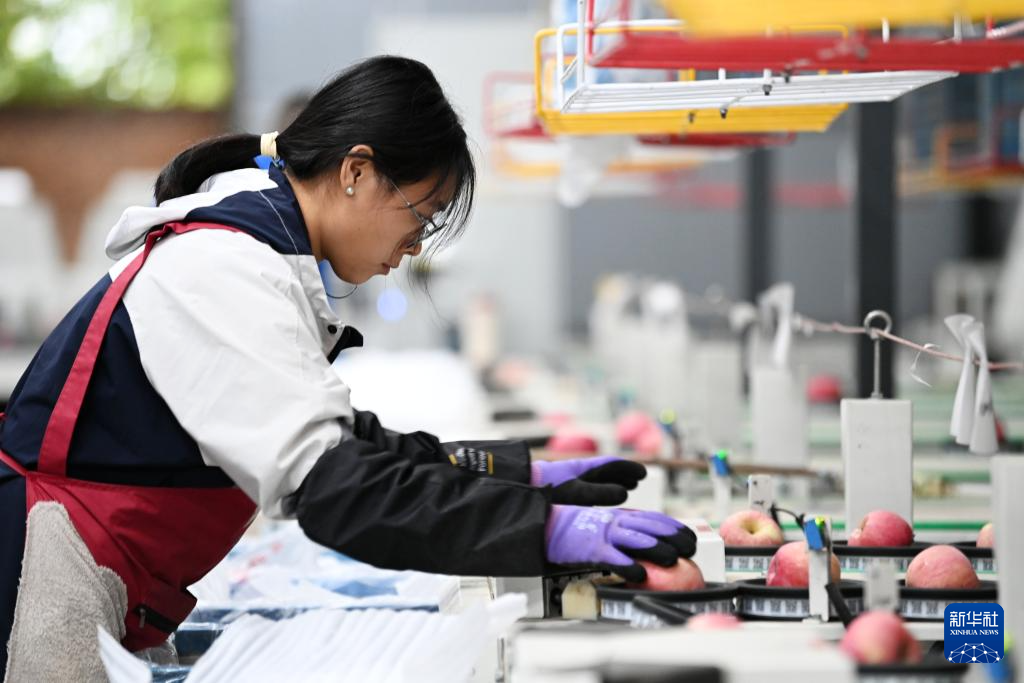 10月18日,工人在渭南市白水县盛隆果业车间分拣苹果。