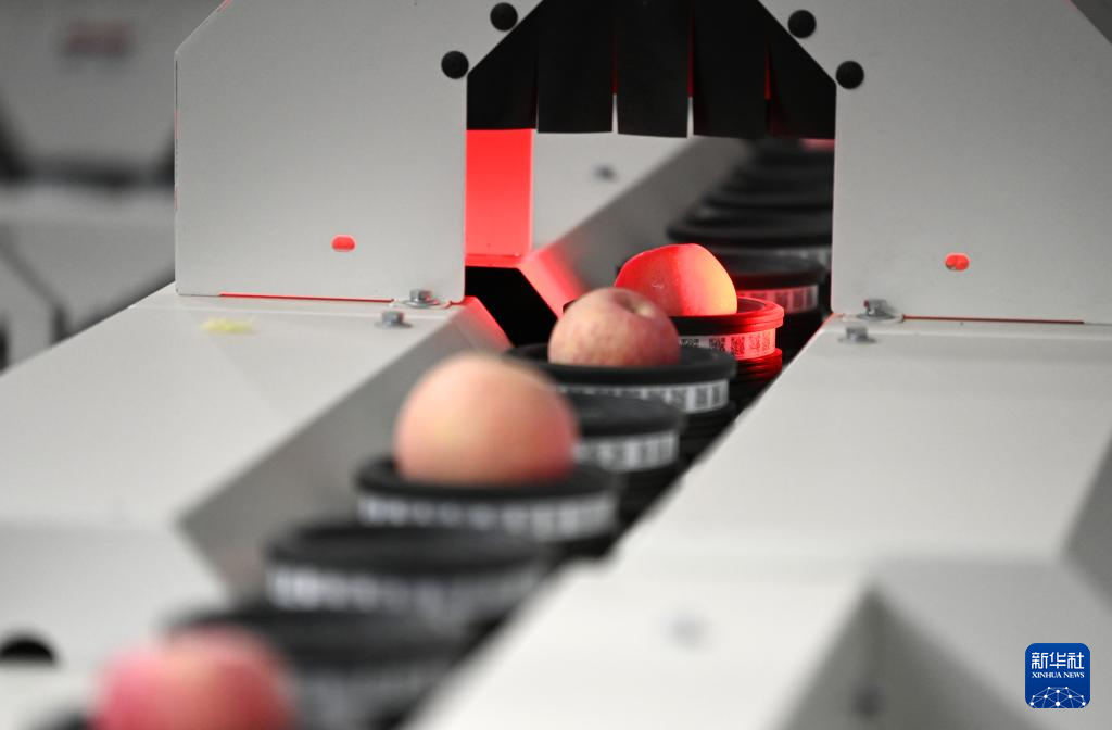 10月18日,渭南市白水县盛隆果业的选果线在自动分拣苹果。