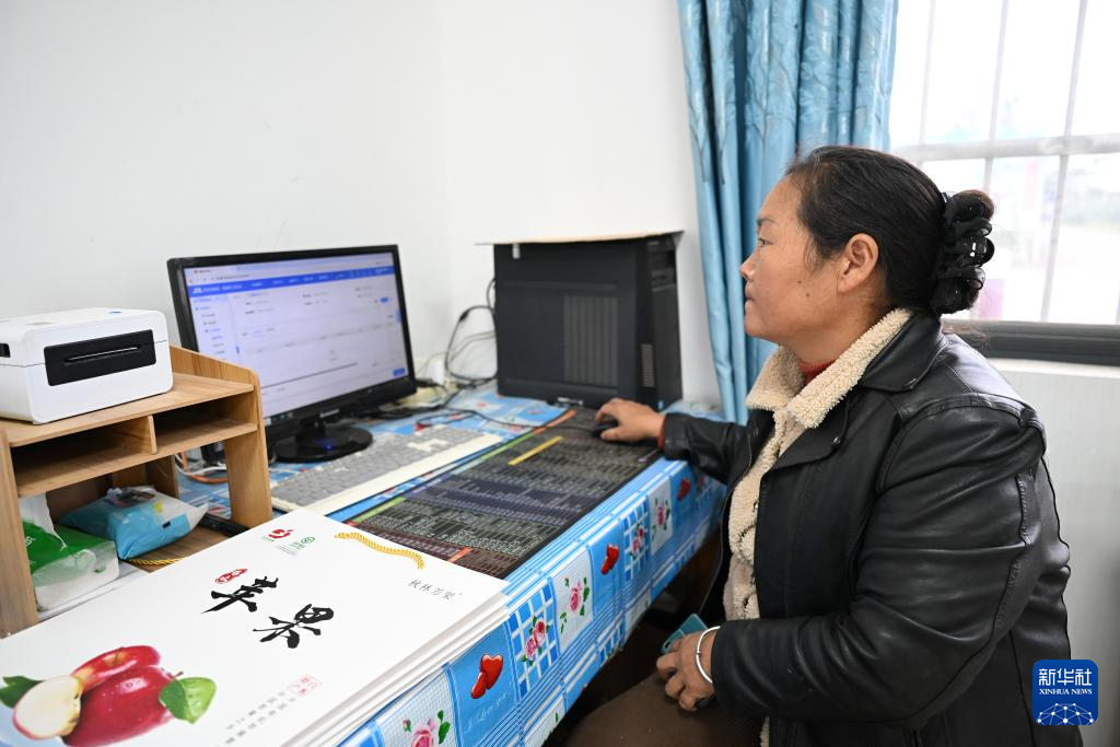 10月18日,在渭南市白水县秋林苹果专业合作社,工作人员林秋娥查看电商销售信息。