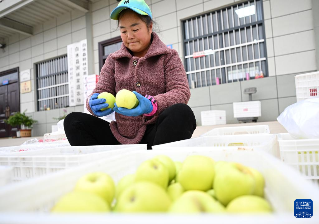 10月18日,在渭南市白水县秋林苹果专业合作社,工人王英英分拣刚采摘的“瑞雪”苹果。