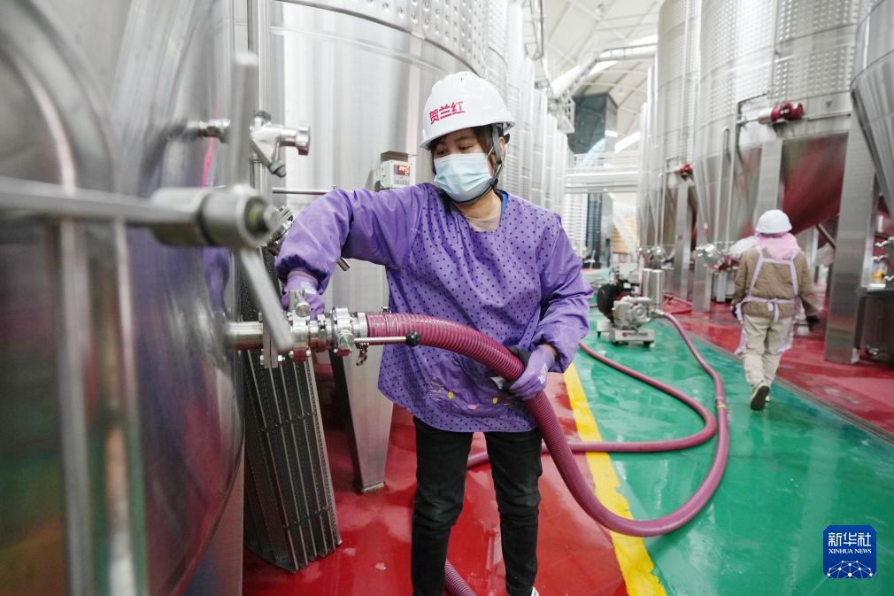 工作人员在银川市永宁县闽宁镇贺兰红酒庄酿酒车间工作(10月14日摄)。