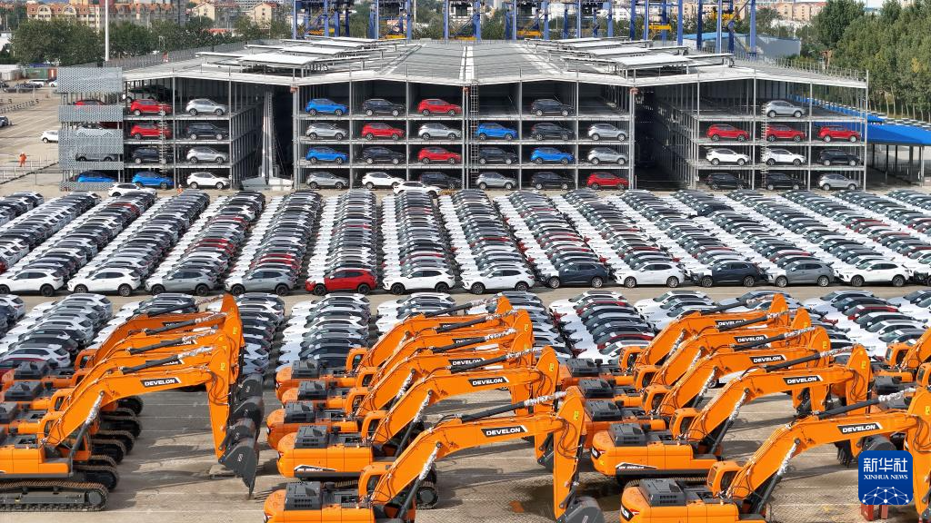 10月20日,国产汽车和工程机械在山东港口烟台港集结等待装船出口(无人机照片)。