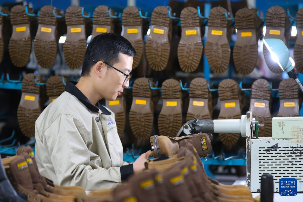 10月20日,工人在山东省高密市海宇股份有限公司加工安防鞋。