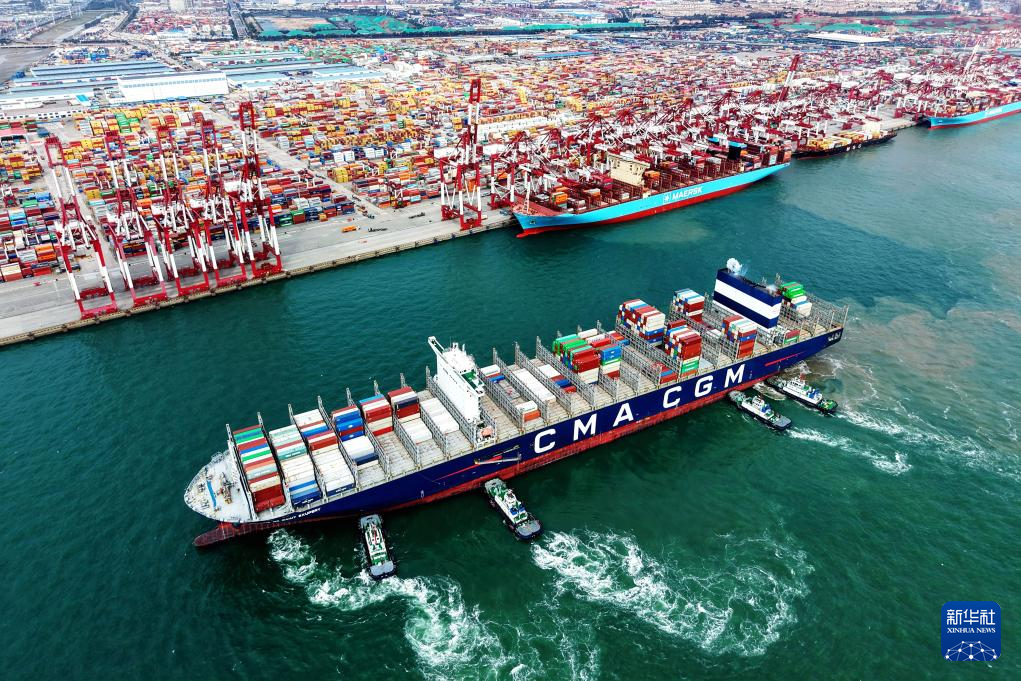 10月20日,在山东港口青岛港,一艘货轮在拖船辅助下停靠集装箱码头(无人机照片)。