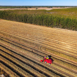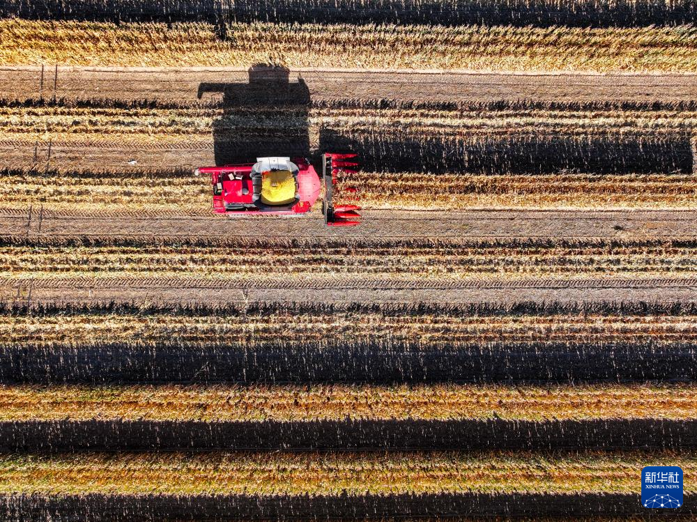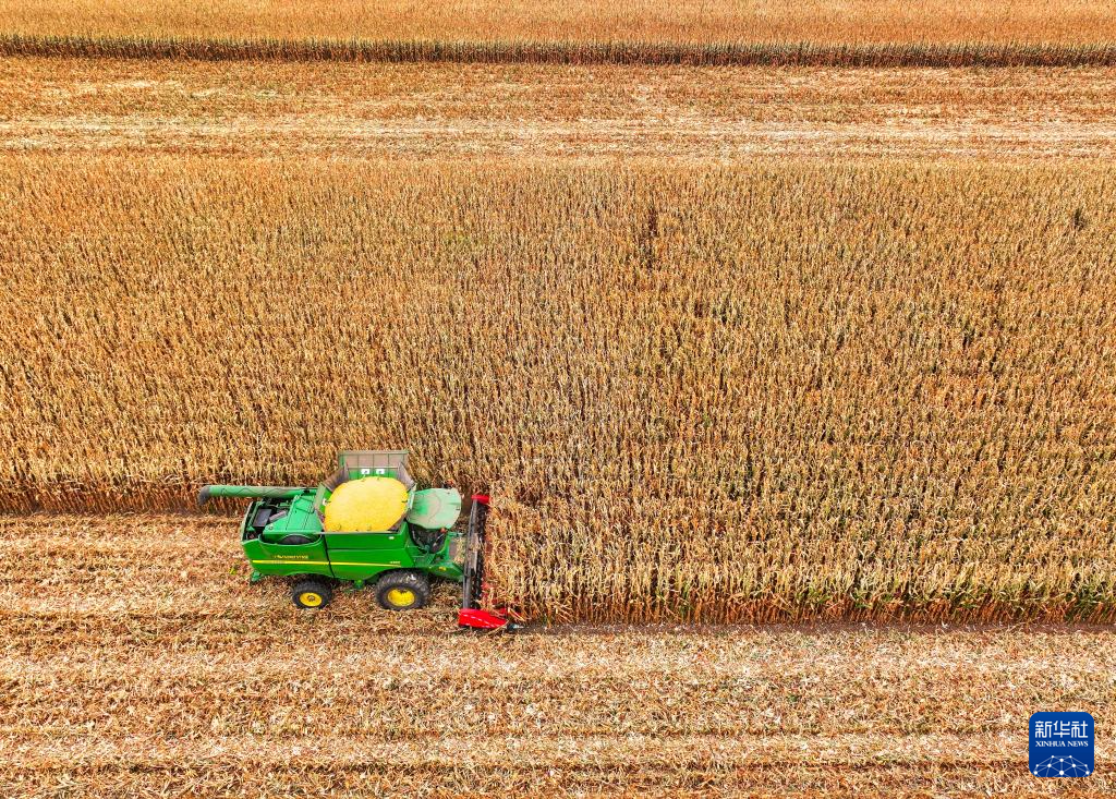 10月14日,在通辽市科尔沁区丰田镇,农机手驾驶收割机收割玉米(无人机照片)。