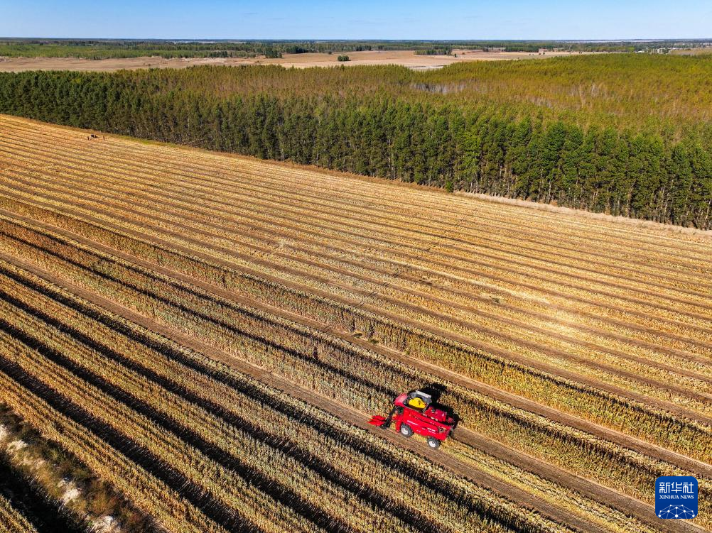 10月15日,在通辽市科尔沁区敖力布皋镇,农机手驾驶收割机收割玉米(无人机照片)。