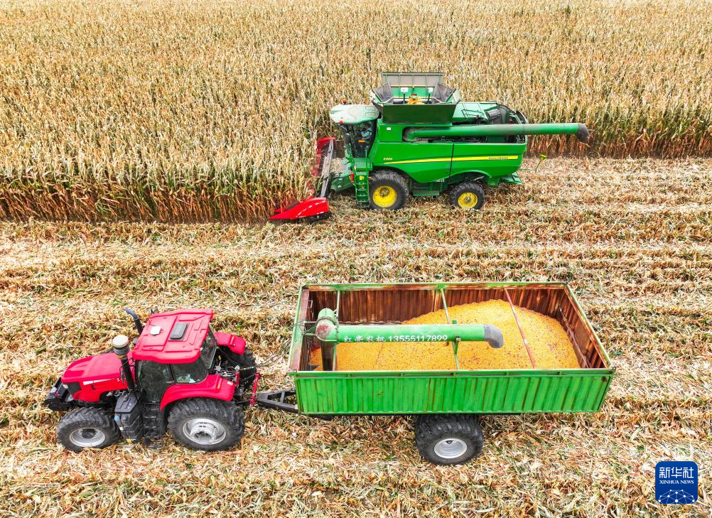 10月14日,在通辽市科尔沁区丰田镇,农机手驾驶收割机把玉米装入卡车。
