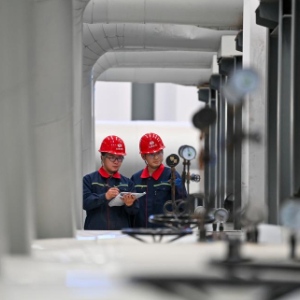 在太原市热力集团有限责任公司中继能源站,工作人员检查设备运行情况(10月19日摄)。