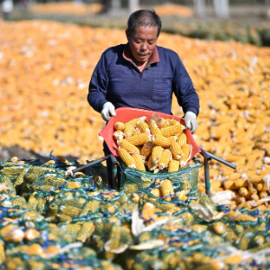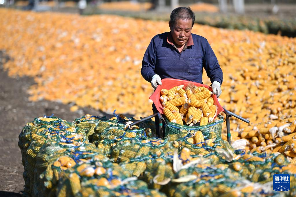10月21日,天津市蓟州区下窝头镇农民在分装玉米。
