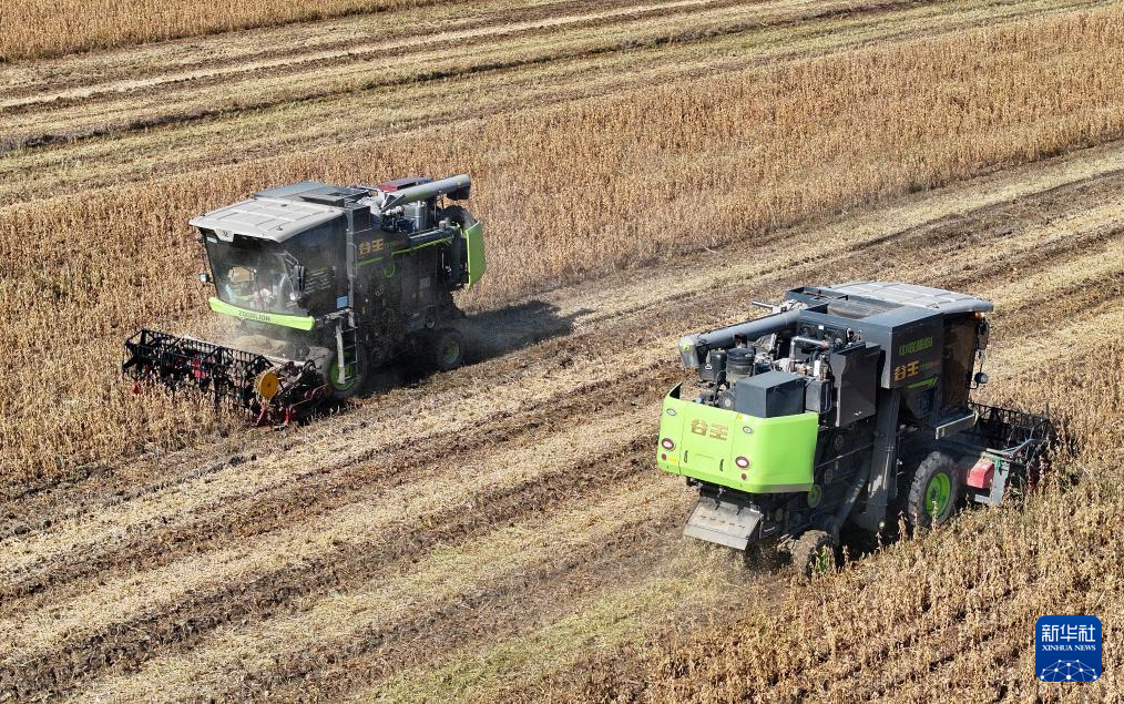 10月21日,收割机在天津市蓟州区下窝头镇收获大豆(无人机照片)。
