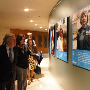 10月20日,在位于纽约的联合国总部,联合国秘书长古特雷斯(前)参观“共栖生命,共享未来”庆祝联合国成立80周年全球图片展。