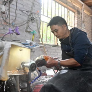 10月21日,在广西龙胜各族自治县三门镇大地村,村民蒙骏宁在家庭作坊加工玉器。