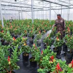 10月22日,在位于金华市金东区赤松镇北山口村的现代化佛手种植大棚,养殖户给佛手盆景浇水。