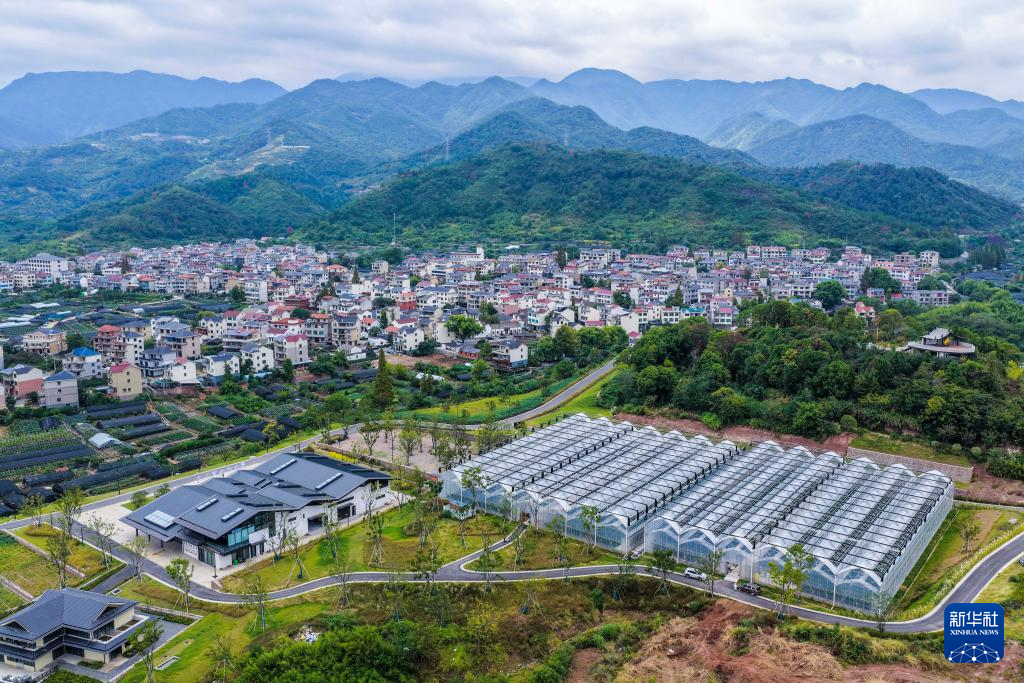 10月22日拍摄的金华市金东区赤松镇北山口村的金华佛手农林服务中心(左下),旁边是配套的现代化佛手种植大棚(无人机照片)。