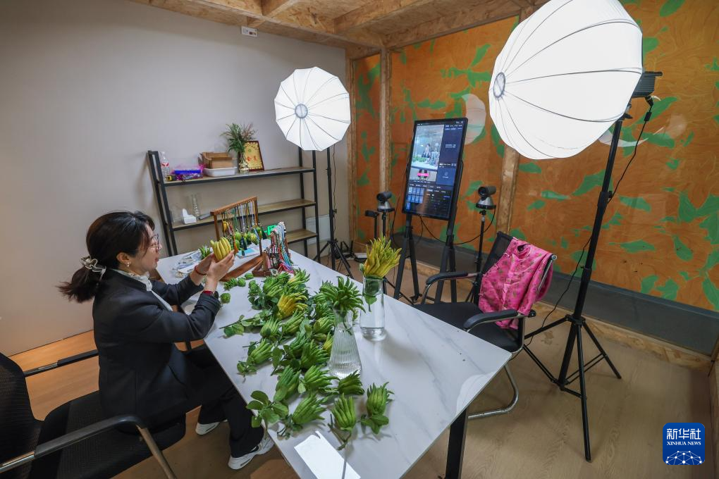 10月22日,在金华市金东区赤松镇北山口村的金华佛手农林服务中心内的直播间,工作人员进行佛手鲜果及衍生产品的直播销售。