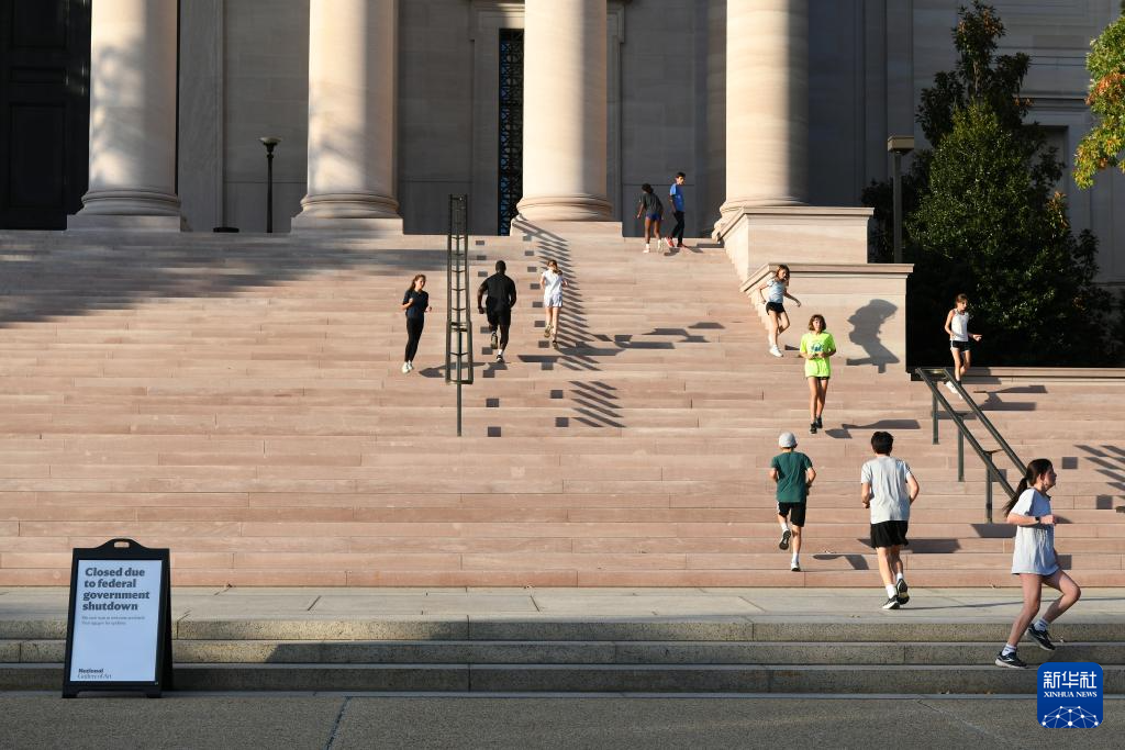 10月21日,在美国华盛顿,孩子们在因联邦政府“停摆”而关闭的美国国家美术馆前进行跑步训练。