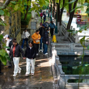 10月22日,人们在山东济南泉水绿道步行观看泉水景观。
