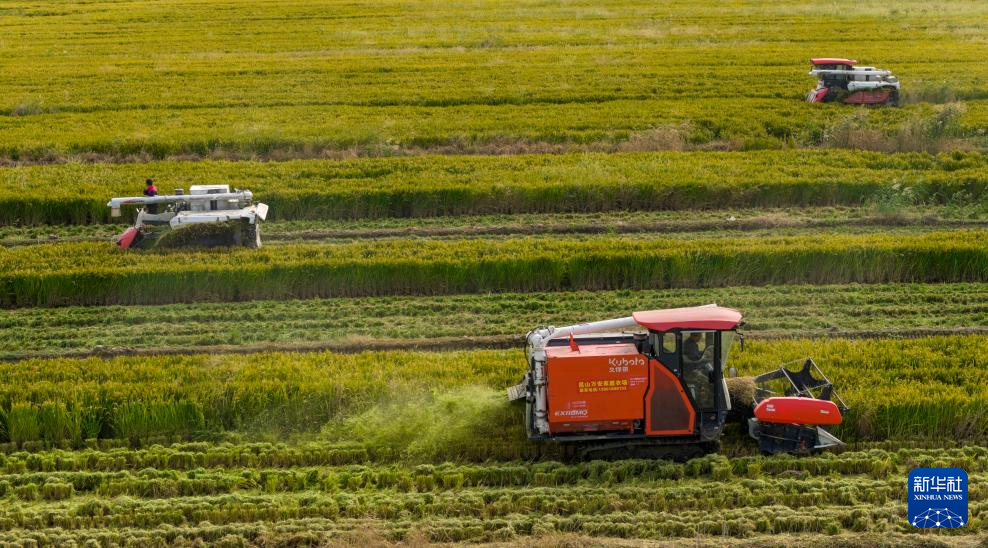 10月23日,收割机在江苏省扬州市邗江区公道镇的稻田里收割水稻(无人机照片)。