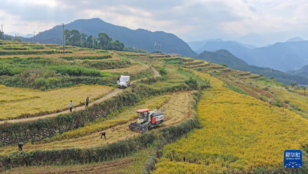 10月23日,农民在浙江省台州市仙居县朱溪镇杨丰山梯田抢收水稻(无人机照片)。