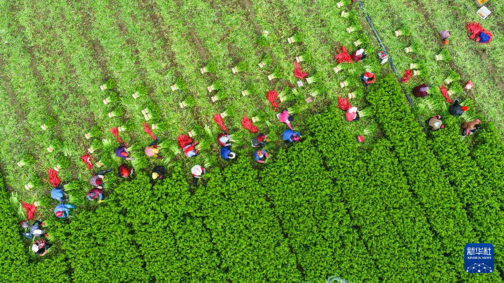 10月23日,农民在山东省东营市广饶县乐安街道一处农田里收割芹菜(无人机照片)。