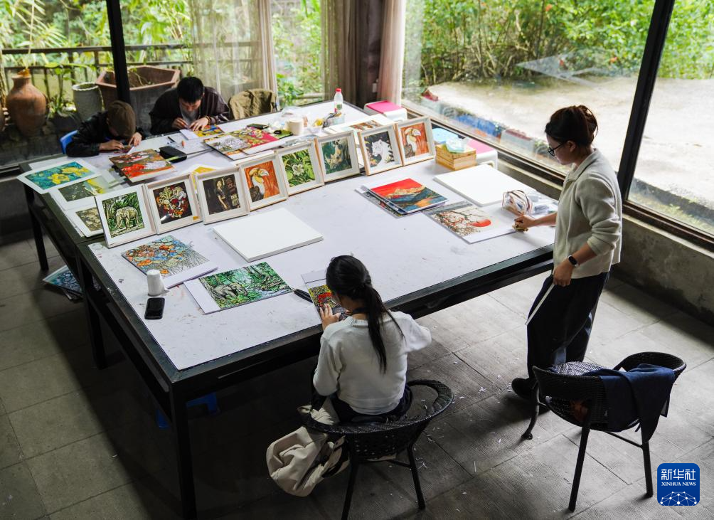 10月22日,在云南普洱学院那柯里绝版木刻教学实践基地,普洱学院艺术学院学生在上色。
