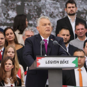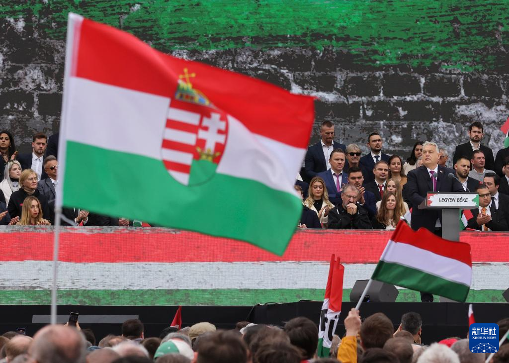 10月23日,匈牙利总理欧尔班(前右)在首都布达佩斯举行的一场集会上讲话。
