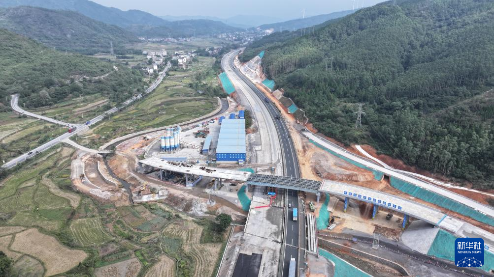这是10月24日在京港澳高速耒宜改扩建工程宜章段施工现场拍摄的宜章北枢纽互通(无人机照片)。