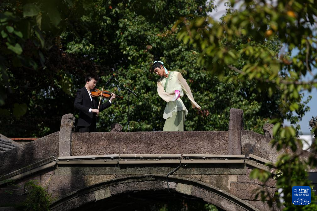 10月24日,演员在新市古镇一座古桥上伴随小提琴声表演。