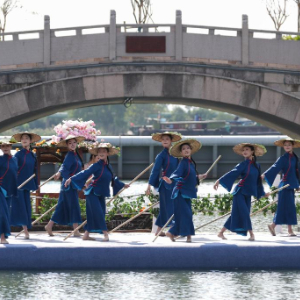 10月24日,浙江歌舞剧院演员在新市古镇表演舞蹈《富春》。