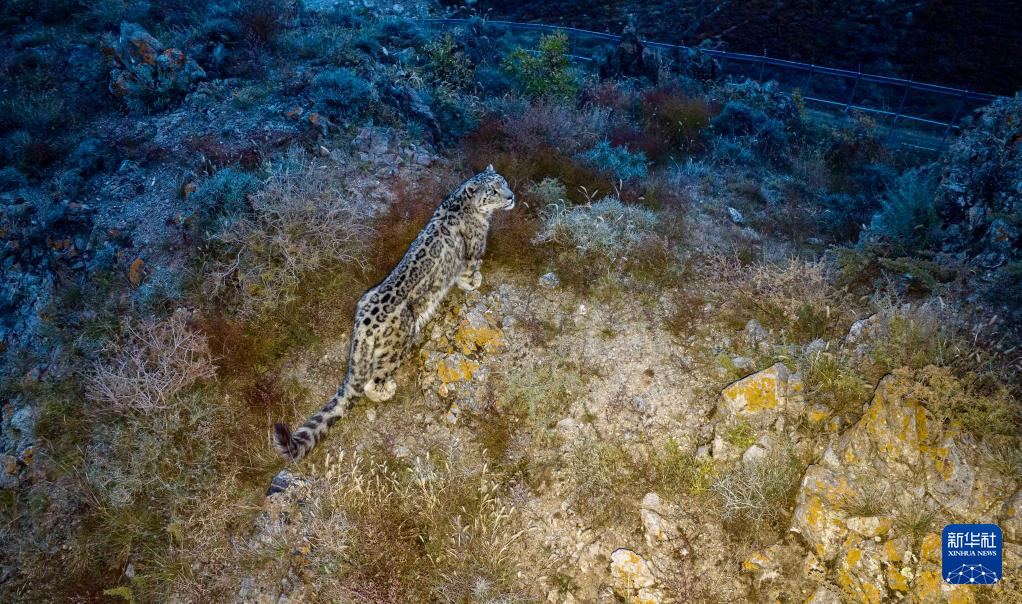 10月24日,在位于宁夏贺兰山国家级自然保护区内的宁夏贺兰山雪豹保护研究基地,雪豹在进行适应性训练(无人机照片)。