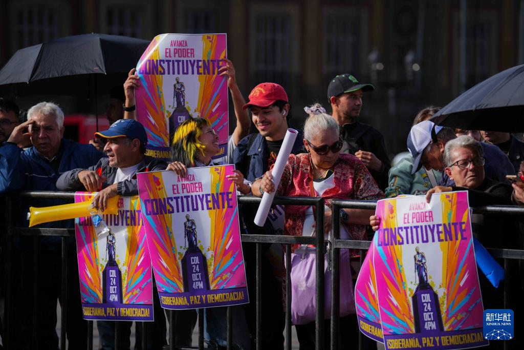 10月24日,在哥伦比亚首都波哥大的玻利瓦尔广场,人们手持支持总统佩特罗提出的全国制宪大会倡议的标语。