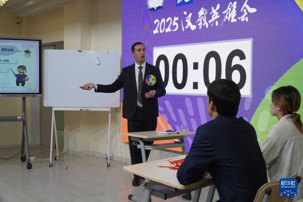 10月24日,在塔吉克斯坦首都杜尚别,乌兹别克斯坦塔什干国立东方大学孔子学院教师绍科西姆·绍鲁斯塔莫夫(中)在比赛中进行教学展示。