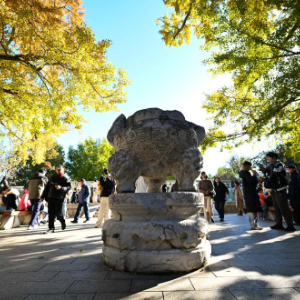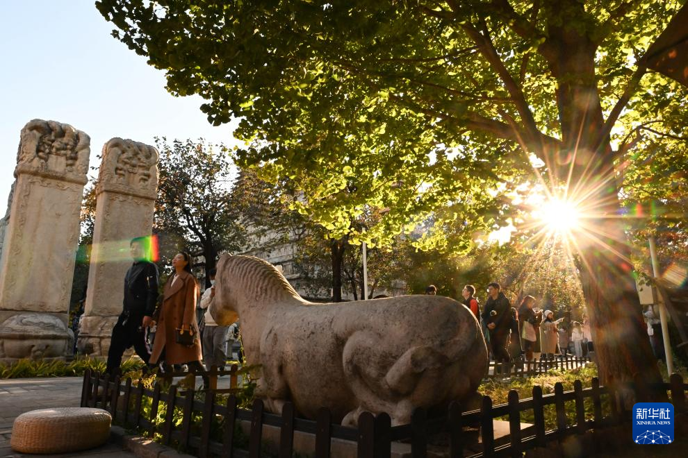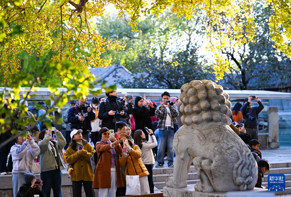 秋冬之交的北京石刻艺术博物馆(也称五塔寺)内,银杏等大面积泛黄,石刻文物掩映在绚烂的色彩中,吸引不少游客前往观赏。