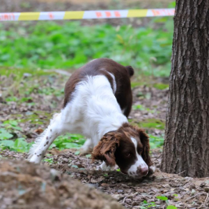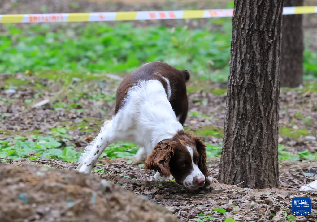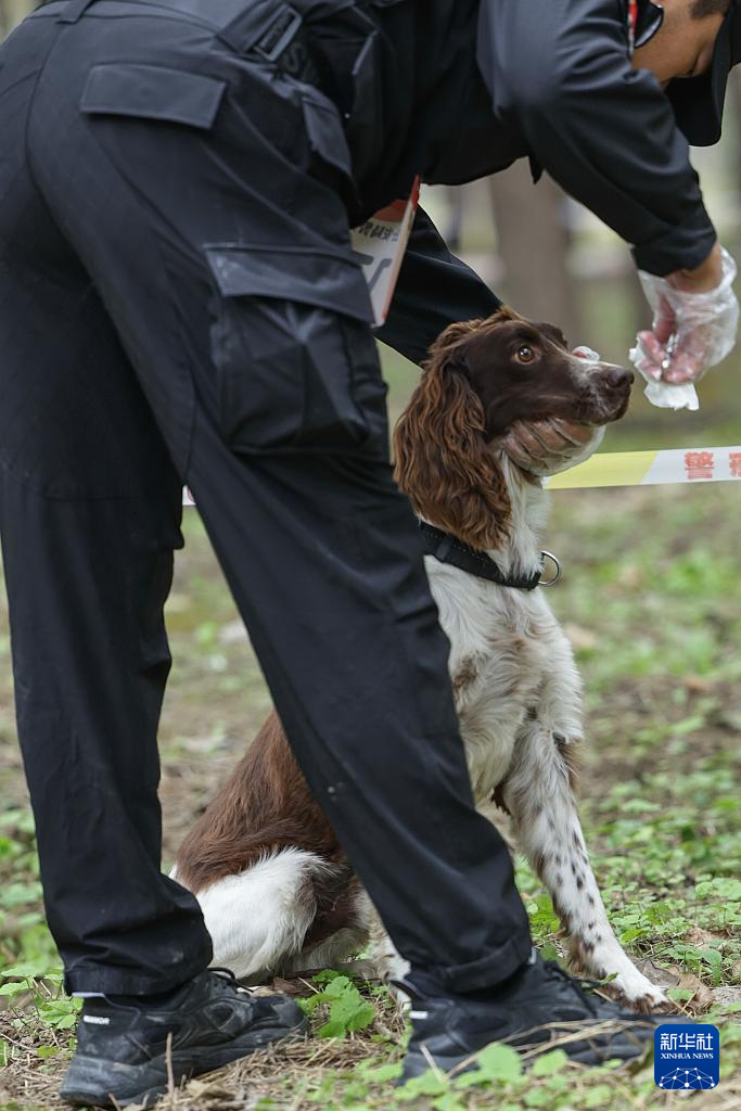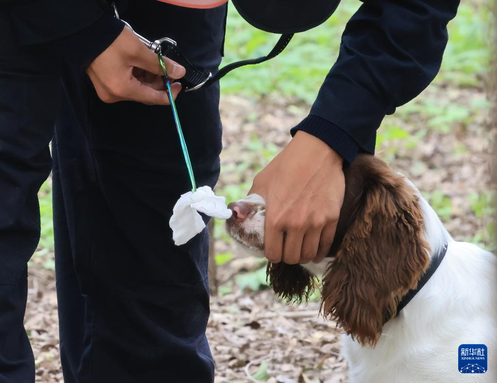 10月24日,参赛警犬在物证搜索课目比赛中闻嗅源。