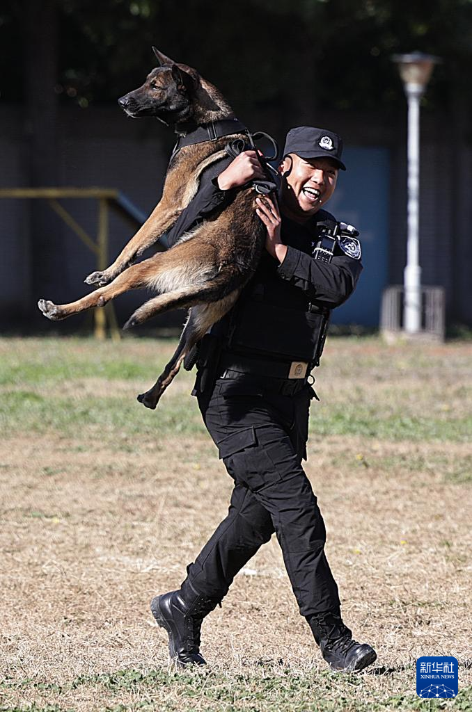 10月26日,一位参赛选手在比赛结束后抱起警犬庆祝。