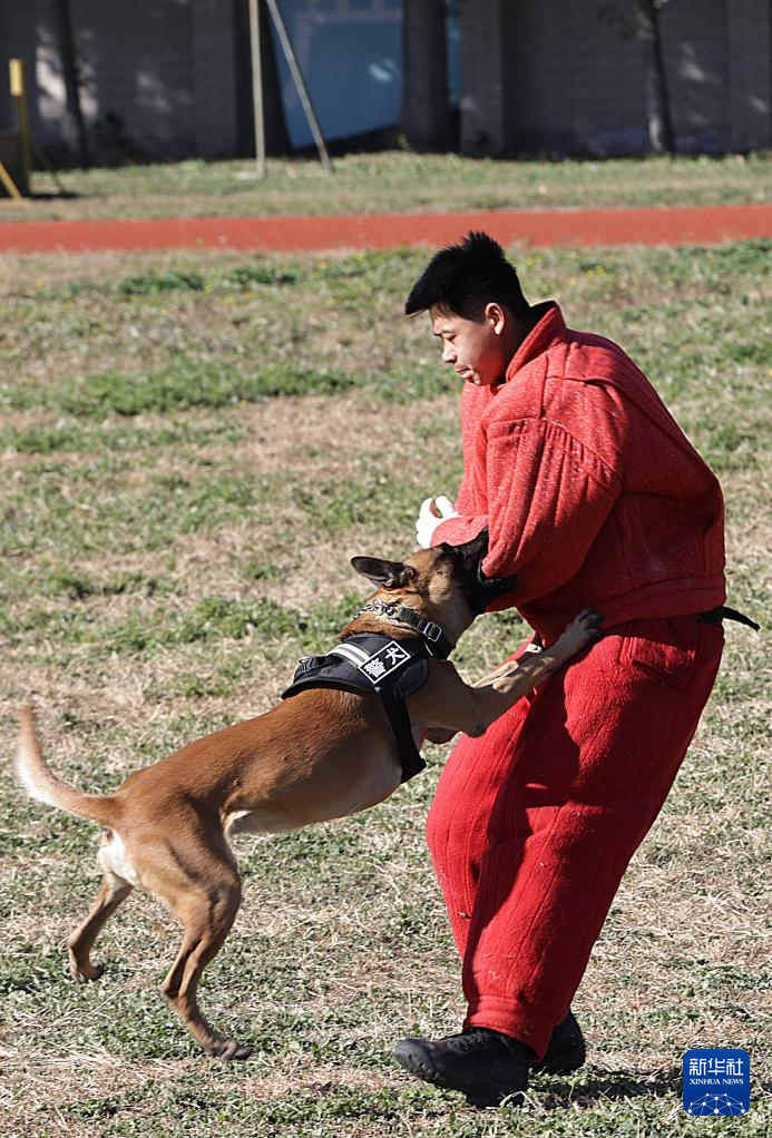 10月27日,参赛选手和警犬在进行基础服从课目比赛。