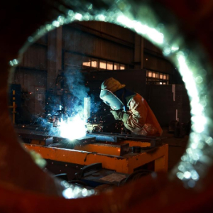 10月27日,中铁科工集团轨道交通装备有限公司技术工人对盾构机盾体配件进行电焊作业。