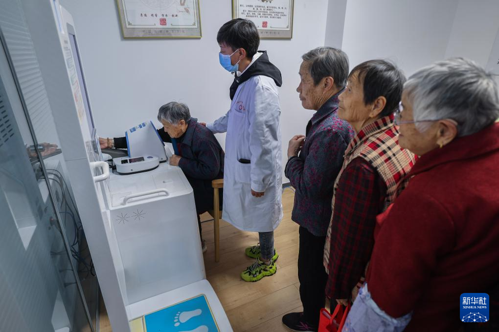 10月28日,在嘉兴市南湖区七星街道湘城社区公共开放空间,医务人员为老人测量血压。
