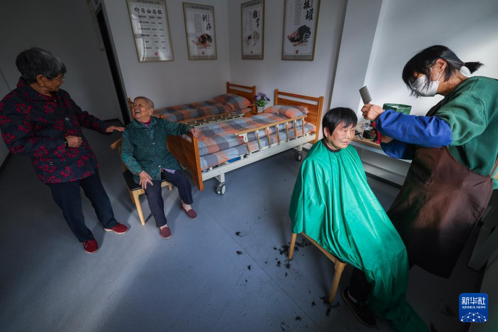 10月28日,在嘉兴市南湖区七星街道湘城社区公共开放空间,志愿者为老人理发。
