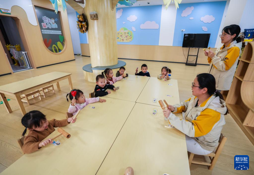 10月28日,在嘉兴市南湖区七星街道湘城社区邻里中心的普惠托育园,保育老师带领幼儿上音乐律动课。