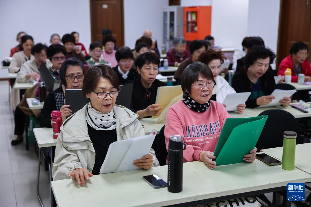 10月28日,在嘉兴市南湖区南湖街道文星社区文化活动室内,社区老年合唱班的成员们在上课。