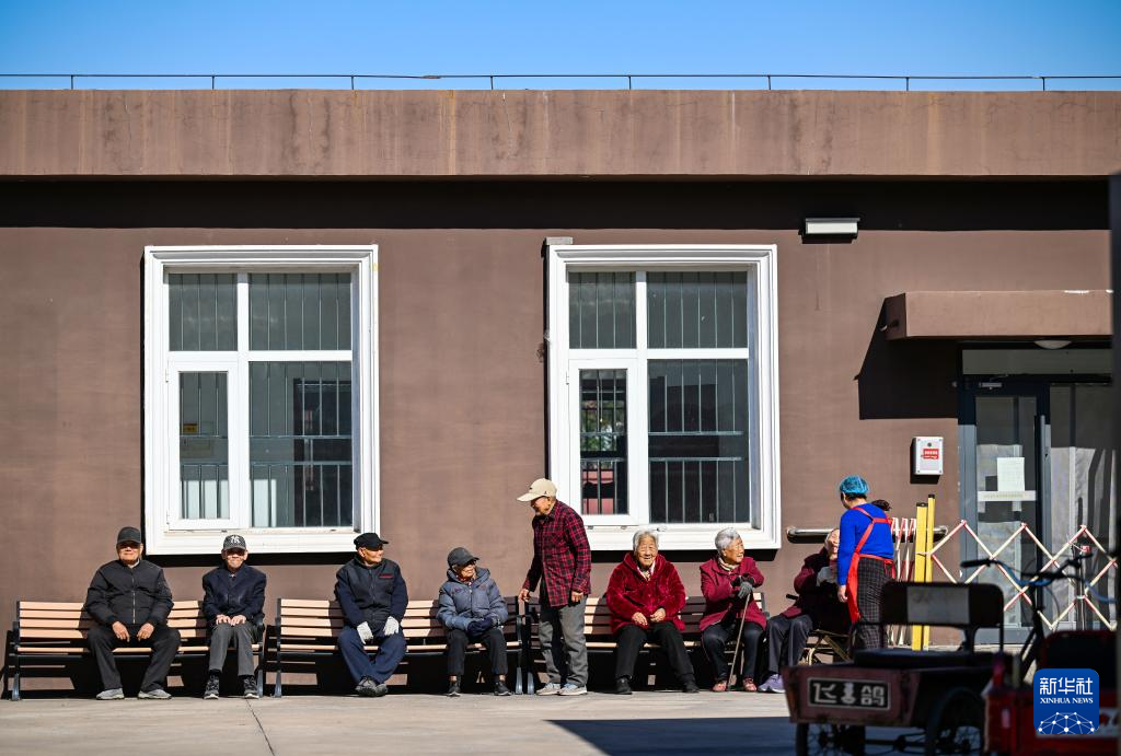 10月27日,在天津市滨海新区古林街道欣欣里社区互助食堂,等候打饭的老人们在院子里聊天休息。