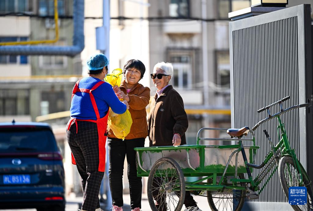10月27日,在天津市滨海新区古林街道欣欣里社区互助食堂,王淑芹(左)接过社区居民送来的红薯。