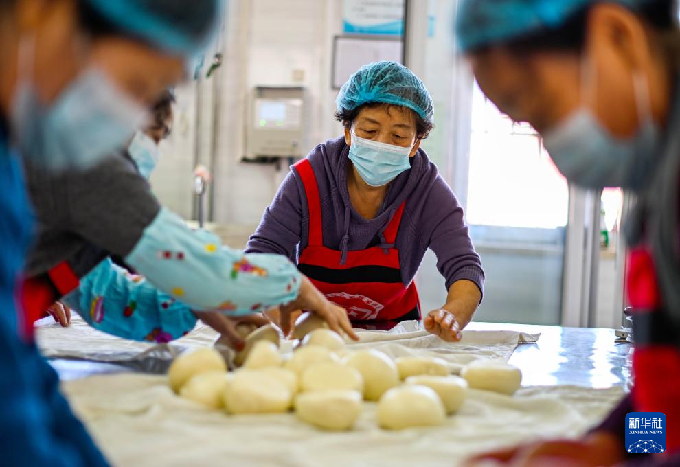 10月27日,在天津市滨海新区古林街道欣欣里社区互助食堂,社区志愿者们揉面做馒头。