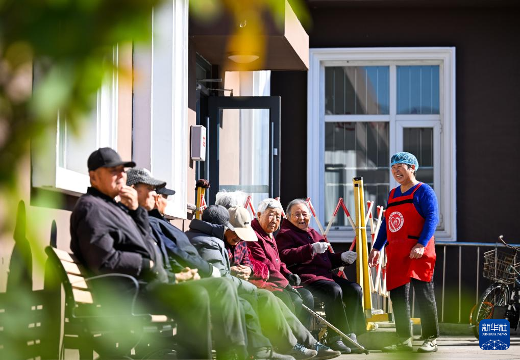 10月27日,在天津市滨海新区古林街道欣欣里社区互助食堂,志愿者王淑芹(右)和老人们在院子里聊天。