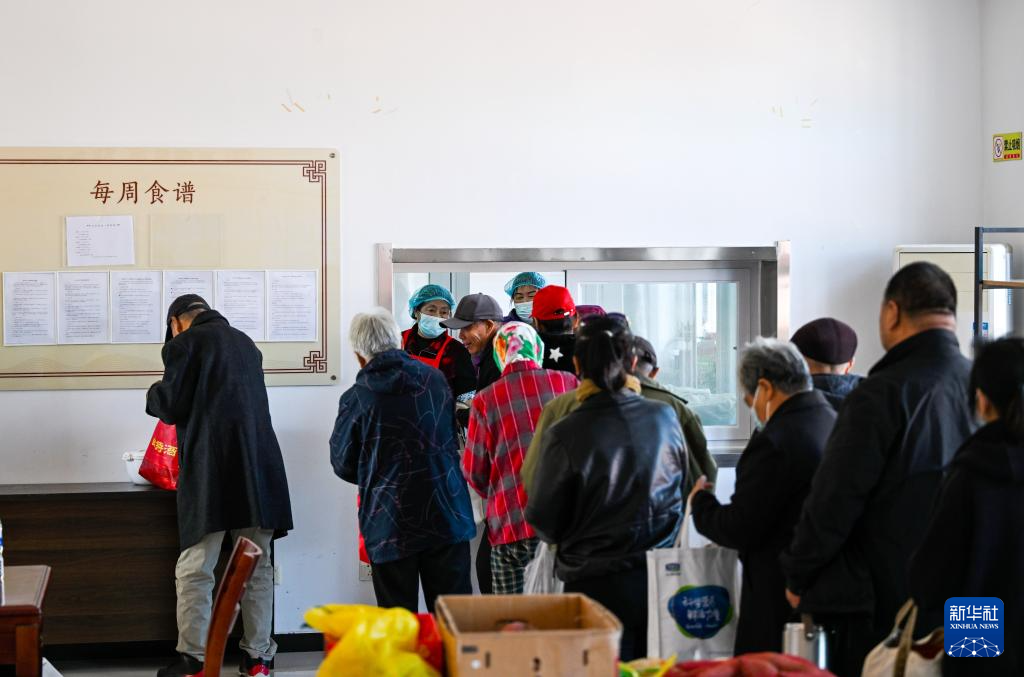 10月27日,在天津市滨海新区古林街道欣欣里社区互助食堂,前来打饭的老人们相互打招呼。