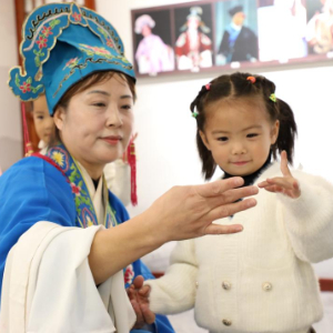 10月27日,在山东省滨州市博兴县吕艺镇“吕剧起源展览馆”,吕剧演员指导小朋友学习传统吕剧表演动作。
